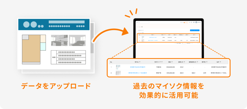 過去のマイソク情報を蓄積し、条件に合う物件をAIが自動でサジェスト。個人の記憶に頼っていた情報を、会社の資産として活用できます。